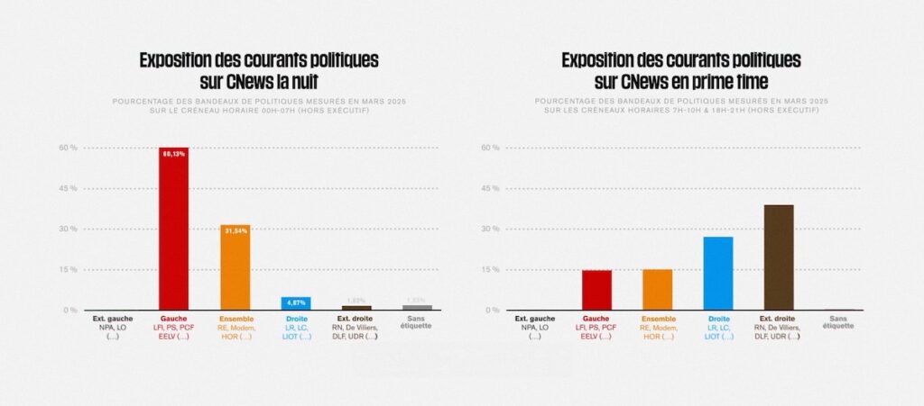 The results of this investigation are clear: while imbalances exist here and there, CNews is the only channel that blatantly and systematically strays from the broadcasting rules in force since July 2024. The privately-owned channel even appears to mock the broadcast regulator by displaying an on‑screen banner asserting compliance with its rules, which were largely trampled throughout the period of our study.